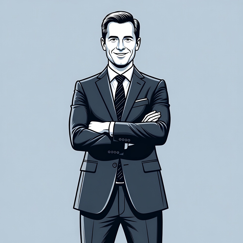 A line art illustration of a smiling man with short dark hair stands confidently with arms crossed. He wears a dark suit, white shirt, and striped tie on a light blue isolated background. The style is clean vector graphic with subtle shading.
