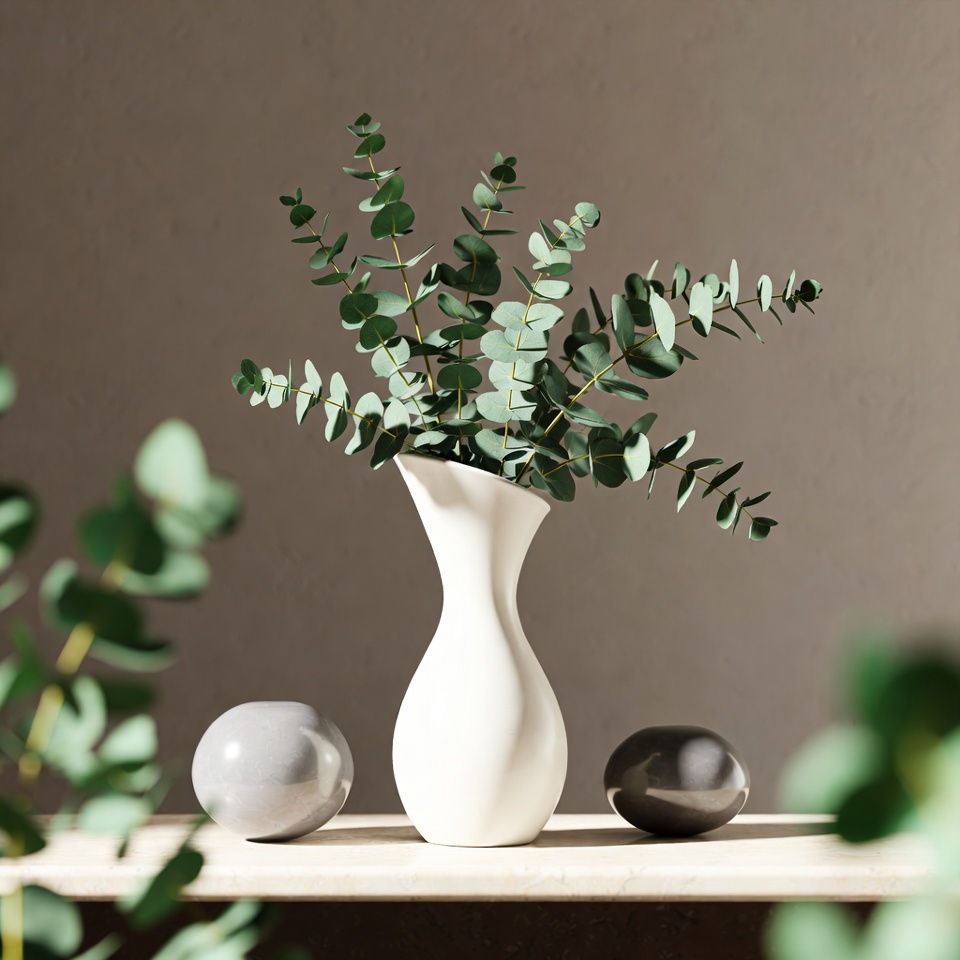 bouquet, branches, decor, floral arrangement, gray stones, green leaves, greenery, home decor, leaves, modern vase, neutral background, pebble stones, plant, still life, table, vase, white vase, eucalyptus