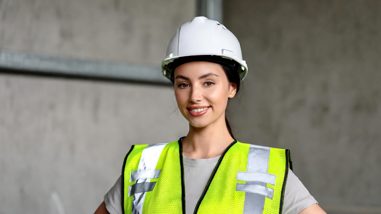 Woman in hard hat and hi-vis vest
