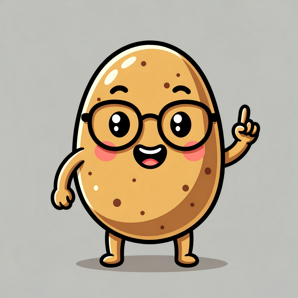 A kawaii cartoon potato character with big eyes, round glasses, and a wide smile stands on a gray background. It has stubby arms and legs, with one arm raised and finger pointing up. The potato features a shiny brown skin with black spots and blush on its cheeks.
