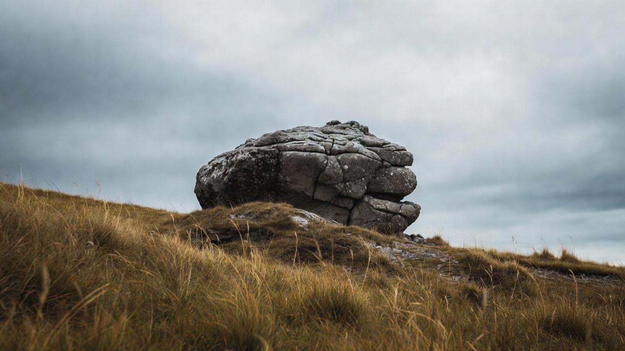 cloudy sky, dramatic sky, earthy tones, grass, grassy hill, hillside, isolated boulder, landscape, large rock, moorland, mossy boulder, nature, outdoors, overcast, rock, rugged rock, stone, terrain, wilderness, boulder