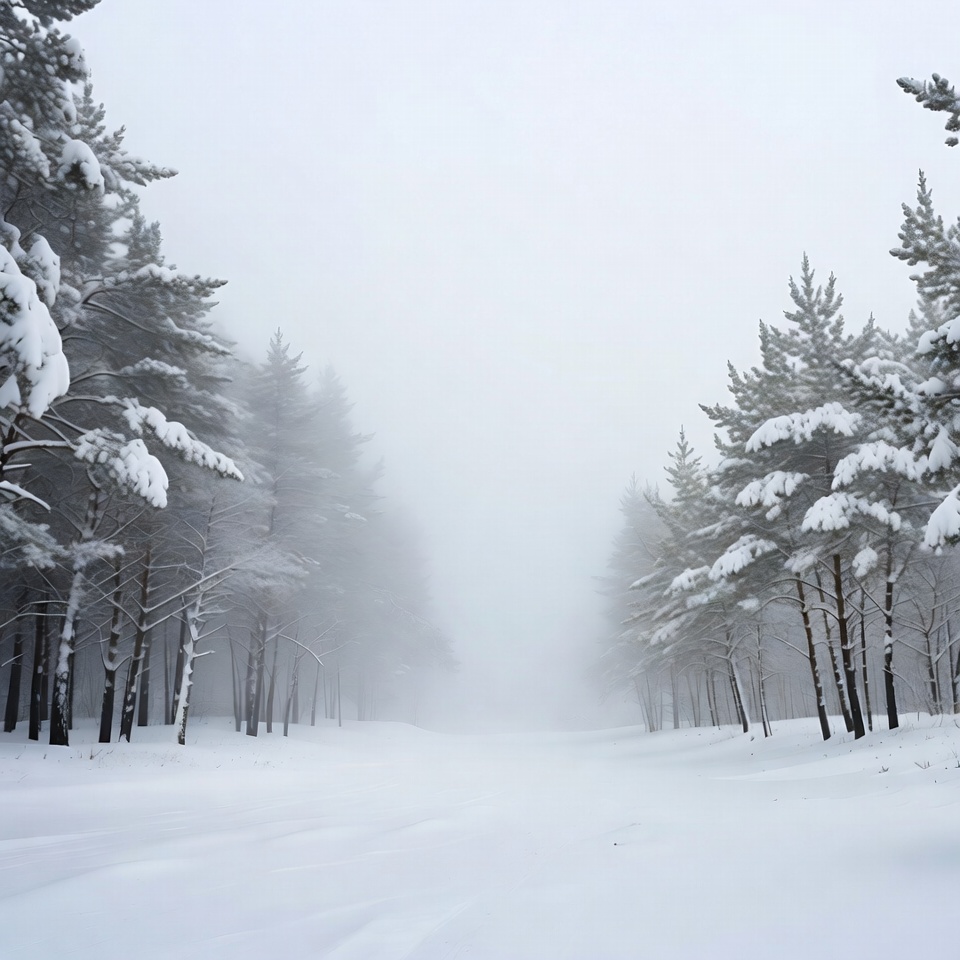 Snowy Pine Forest Path in Fog