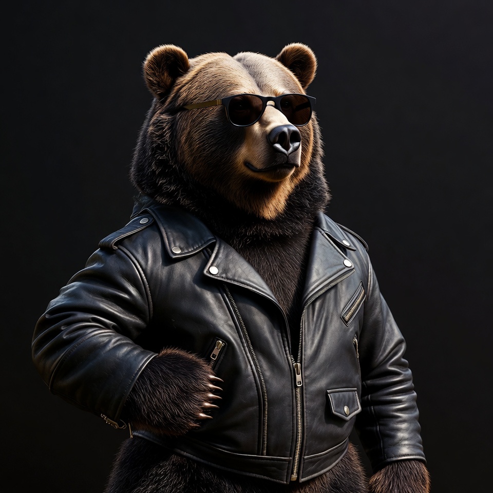 A realistic 3D rendered grizzly bear stands confidently against a black background. It wears dark sunglasses and a black leather biker jacket with silver zippers. The bear has fluffy brown fur and a slight smile.