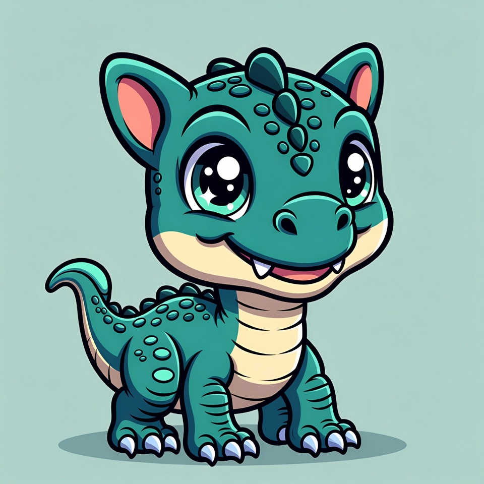 adorable dragon, baby dinosaur, big eyes, cartoon dragon, chibi dragon, claws, clipart, cute dragon, dragon illustration, fantasy creature, green dragon, isolated background, kawaii dragon, orange ears, smiling dragon, spikes, tail, teal dragon, vector art, baby dragon
