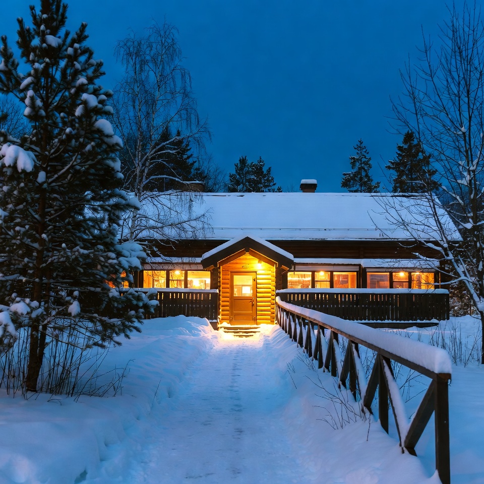 A cozy wooden cabin with snow-covered roof stands in a snowy landscape under a dark blue night sky. Warm lights glow from the windows and illuminate the yellow front door and a wooden bridge walkway leading through deep snow. Tall pine trees with snow on their branches frame the cabin.