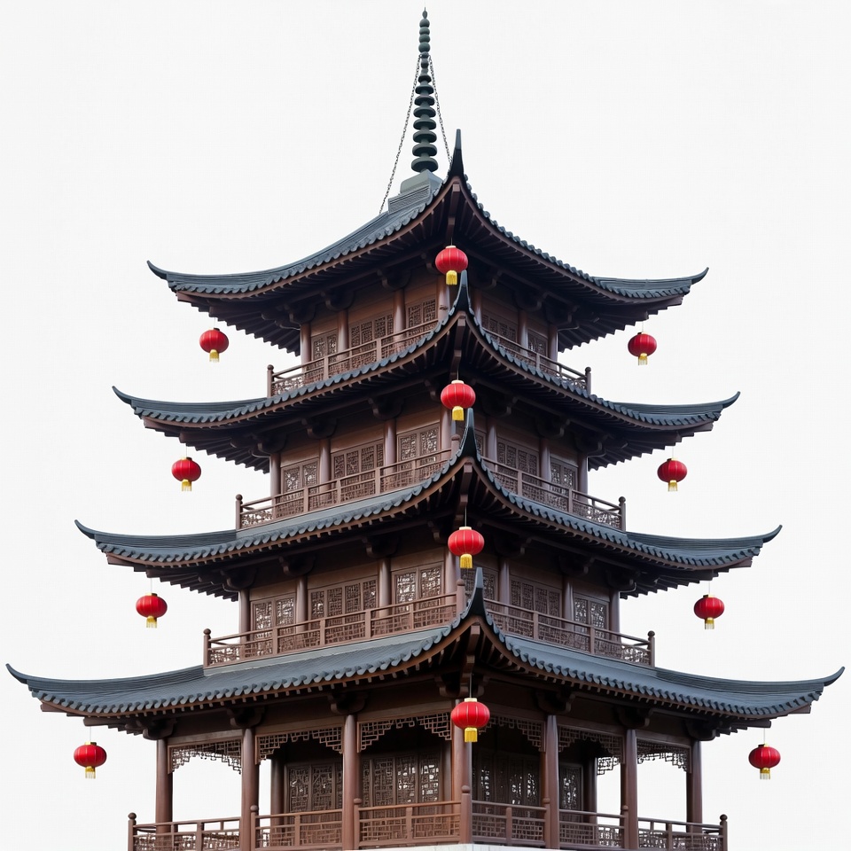 Asian architecture, architecture, clipart, gray roofs, isolated background, lanterns, multi-tiered, pagoda, red lanterns, temple, traditional Chinese, upturned eaves, wooden structure, Chinese pagoda