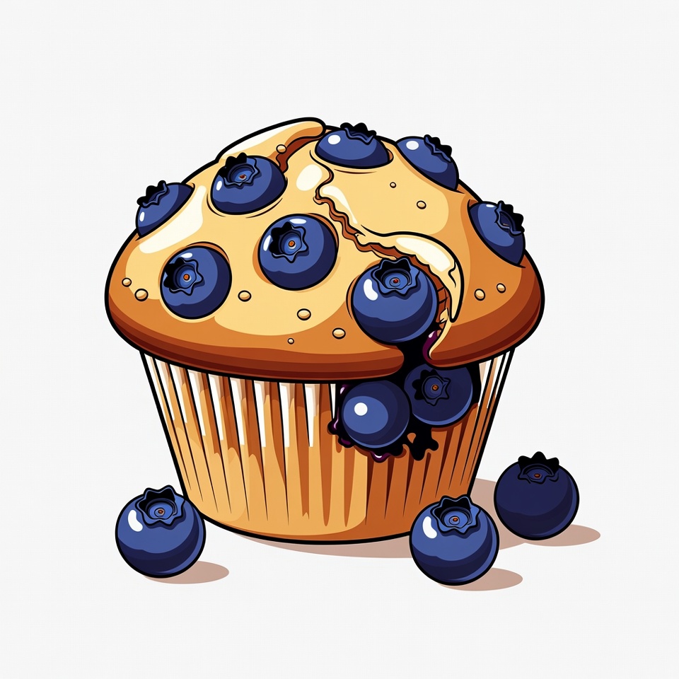 baked goods, blueberries, breakfast food, cartoon, clipart, cracked top, dessert, food, golden brown, illustration, isolated background, juicy berries, muffin, pastry, sweet treat, vector art, blueberry muffin