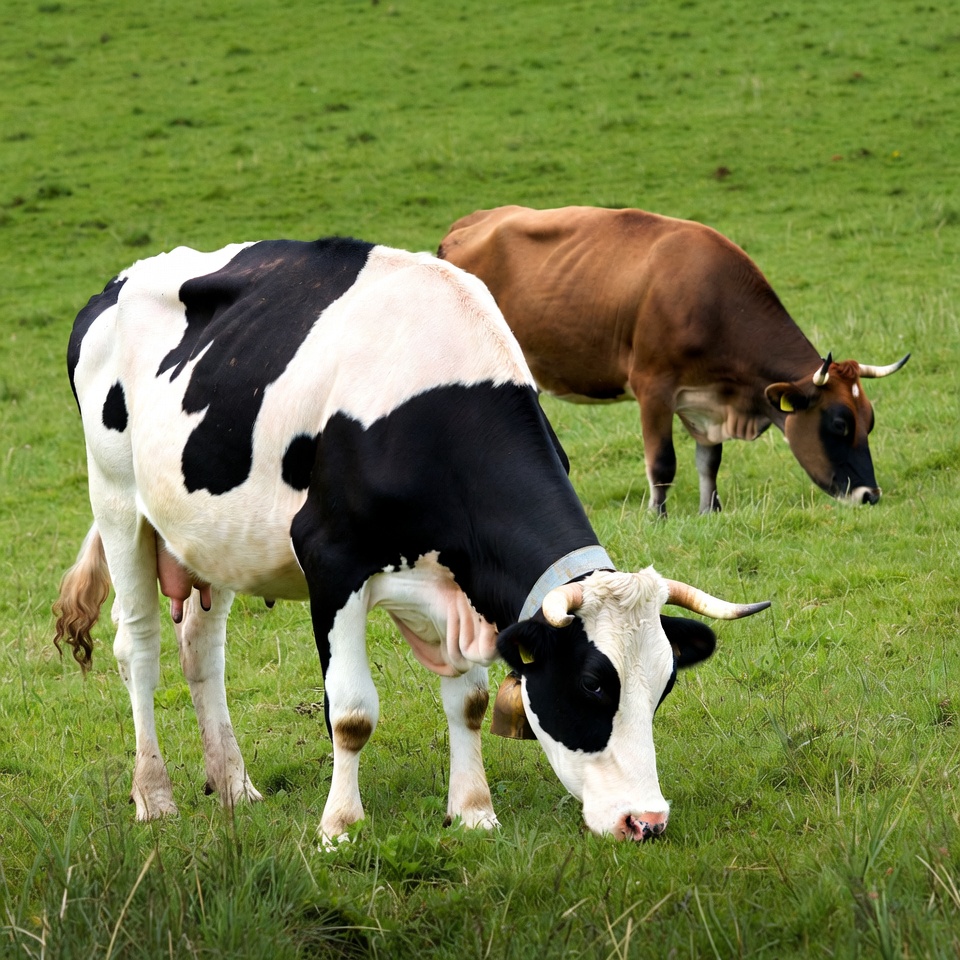 A black and white Holstein cow with a collar grazes on lush green grass in a field. A brown cow stands nearby, also eating grass. Both cows are positioned on a vibrant green pasture under open sky.
