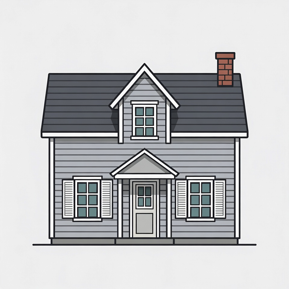A simple line art illustration of a two-story gray house with shingled siding and dark gray roof. It features a central front door under a small porch, flanked by shuttered windows, and a brick chimney on the roof. The house stands on a white isolated background.