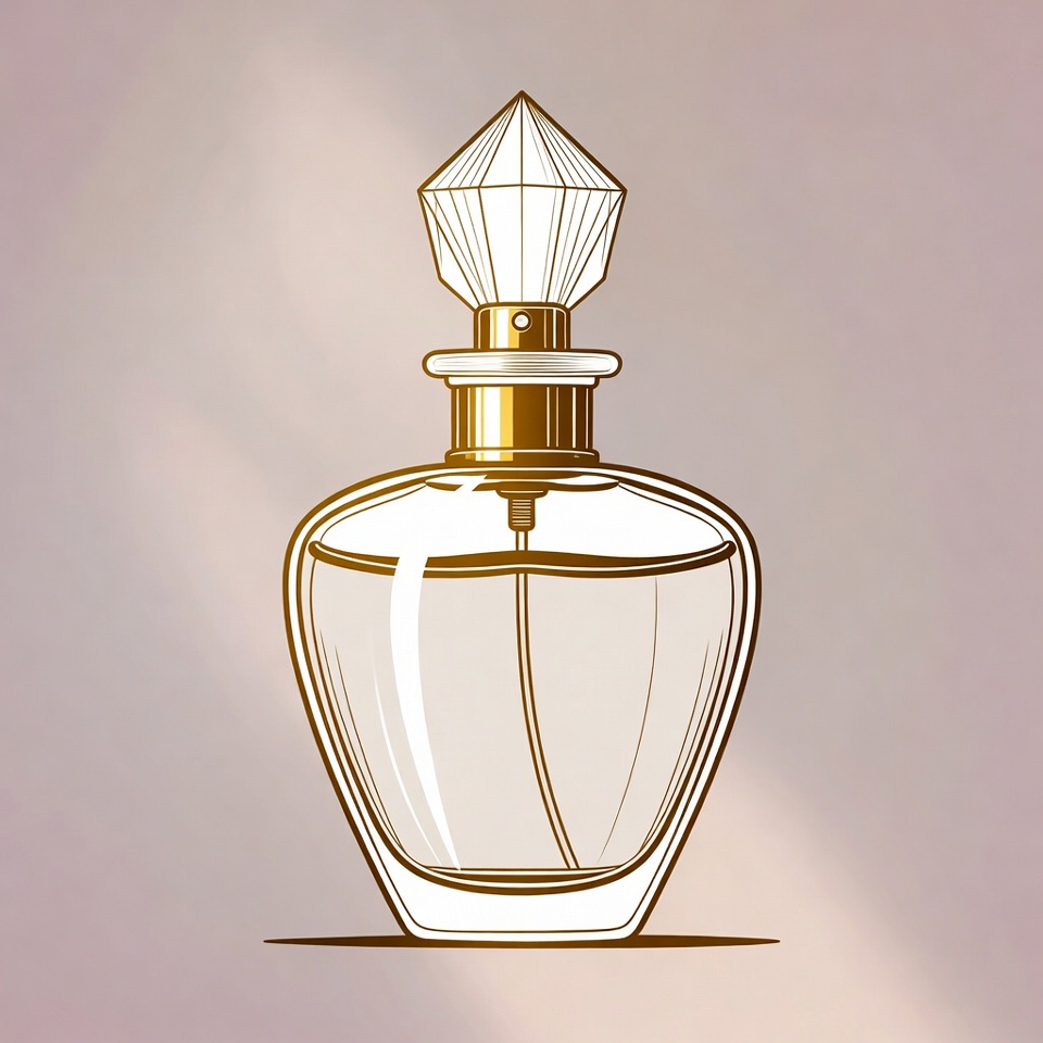A line art illustration of a luxurious perfume bottle with a faceted diamond-shaped cap. The bottle features a gold spray nozzle and a curved glass body filled with clear liquid. It is depicted on a soft pinkish gradient background with subtle shading.