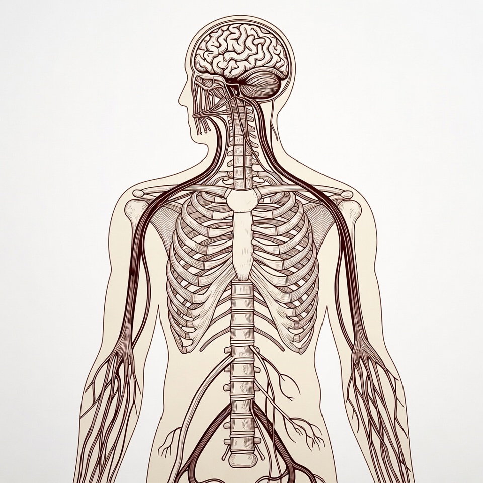 White, anatomical diagram, arteries, biology, blood vessels, body systems, brain, education, heart, human anatomy, illustration, line art, male, medical illustration, rear view, ribs, science, skeleton, spine, veins, circulatory system