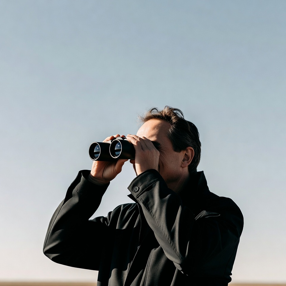 A middle-aged White man with short brown hair looks through black binoculars outdoors. He wears a dark jacket and stands against a clear blue sky. His hands grip the binoculars firmly as he scans the horizon.