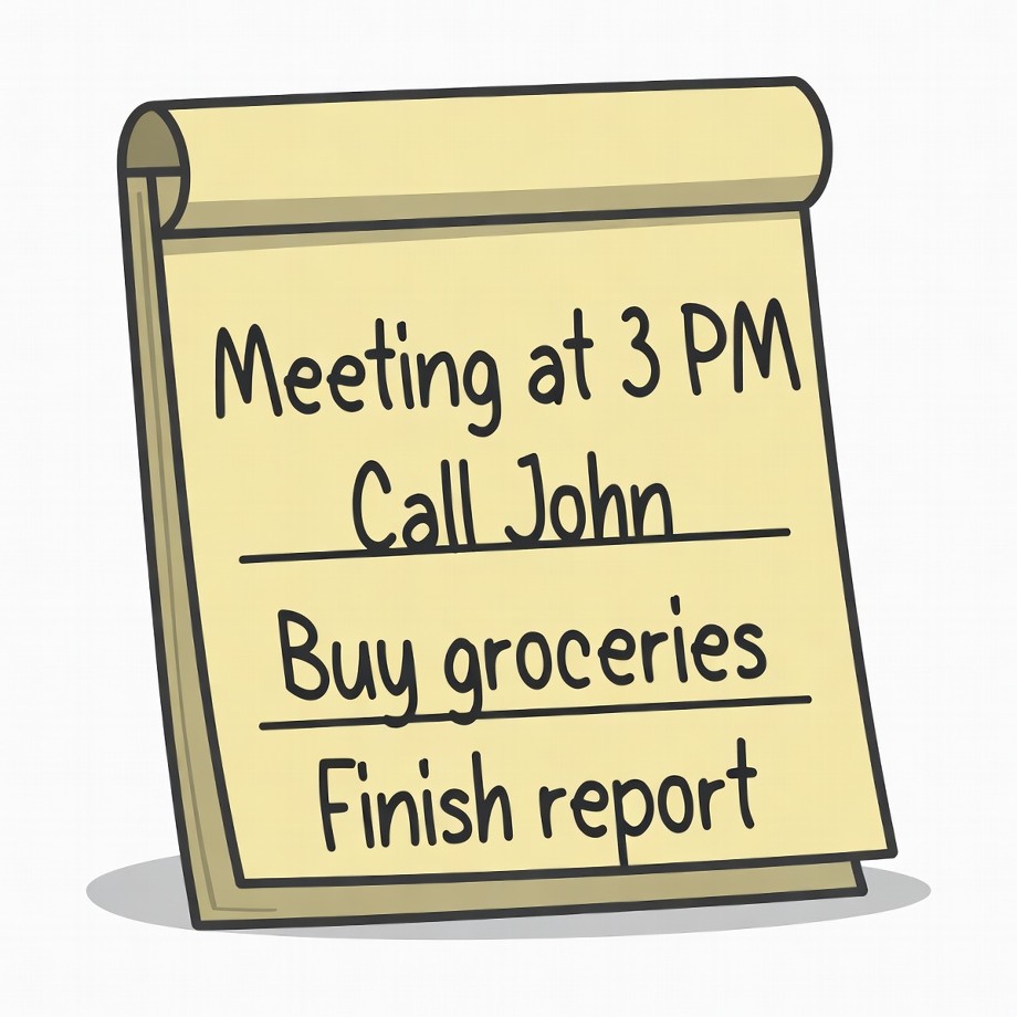 A yellow cartoon sticky note stands upright on a white background. It lists tasks including 'Meeting at 3 PM', 'Call John', 'Buy groceries', and 'Finish report'. The note has a simple illustrated design with handwritten-style text.