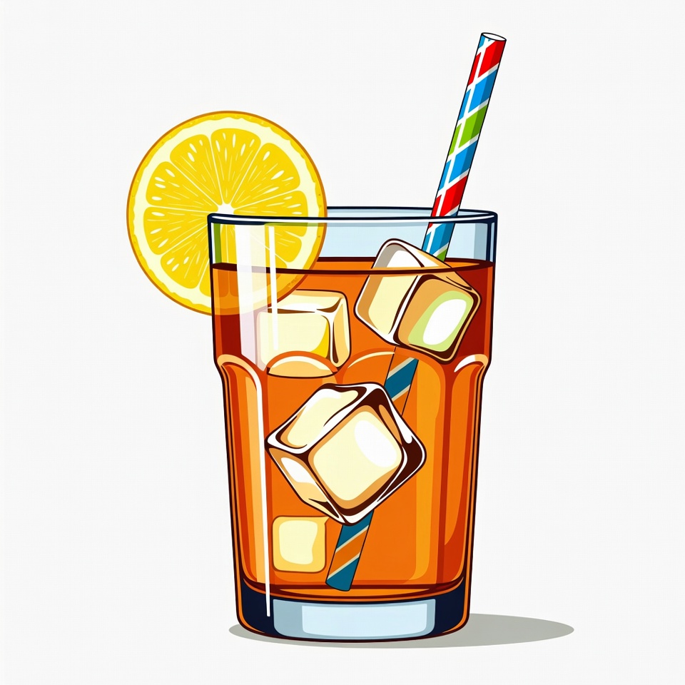 A vibrant illustration of a tall glass filled with iced tea and ice cubes. A fresh lemon slice garnishes the rim, and a colorful striped straw sticks out from the glass. The image features a clean white background with a subtle shadow.