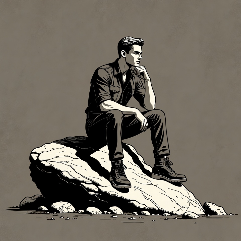 A young man with short slicked-back hair sits on a large rock in a black and white illustration. He wears a collared shirt with rolled sleeves, dark pants, and boots, with his legs crossed and hand on chin in thought. Smaller rocks surround the base of the main rock on a plain background.