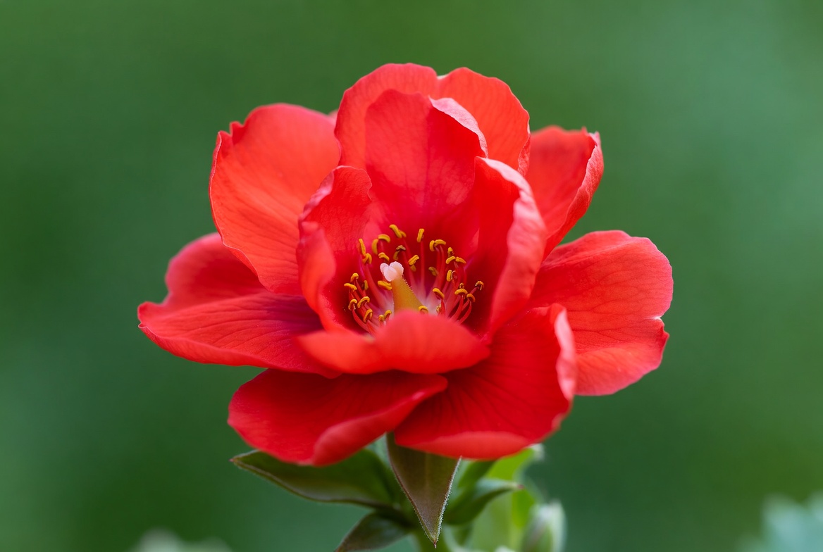 blooming flower, camellia flower, closeup, floral, flower bloom, flower stem, garden flower, green background, green leaves, macro flower, nature, petals, plant, red flower, stamen, yellow center, red camellia