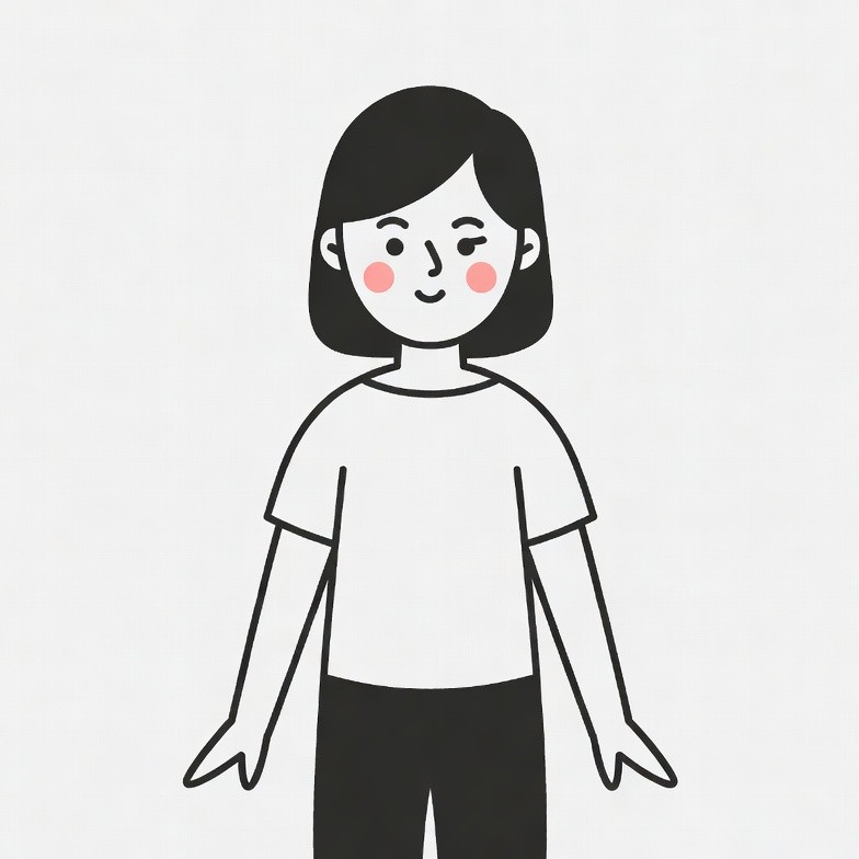 Asian, arms outstretched, black hair, black pants, cartoon girl, cheerful expression, clipart, female, illustration, isolated background, line art, pink cheeks, short hair, simple drawing, standing, vector art, white t-shirt, young girl, girl