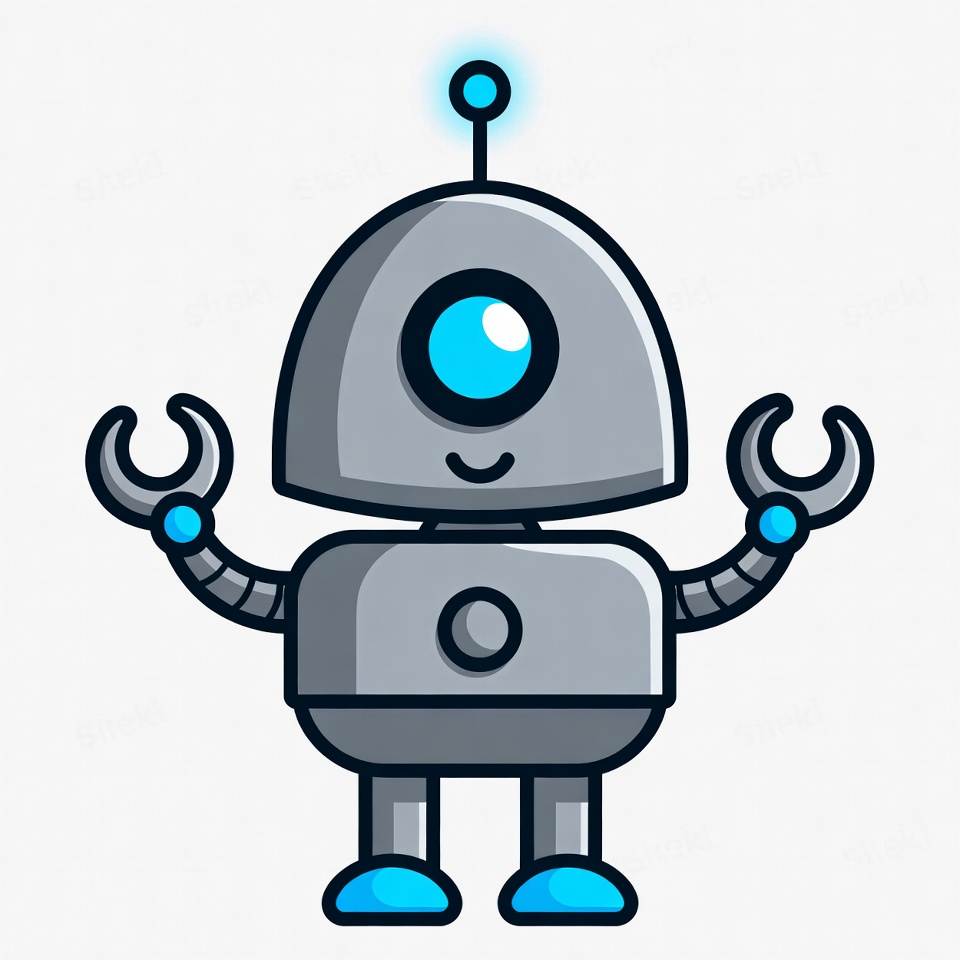 blue accents, blue eyes, cartoon robot, clipart, cute robot, friendly robot, gray robot, illustration, isolated background, robot arms, robot claws, robotic character, sci-fi robot, smiling robot, vector robot, robot