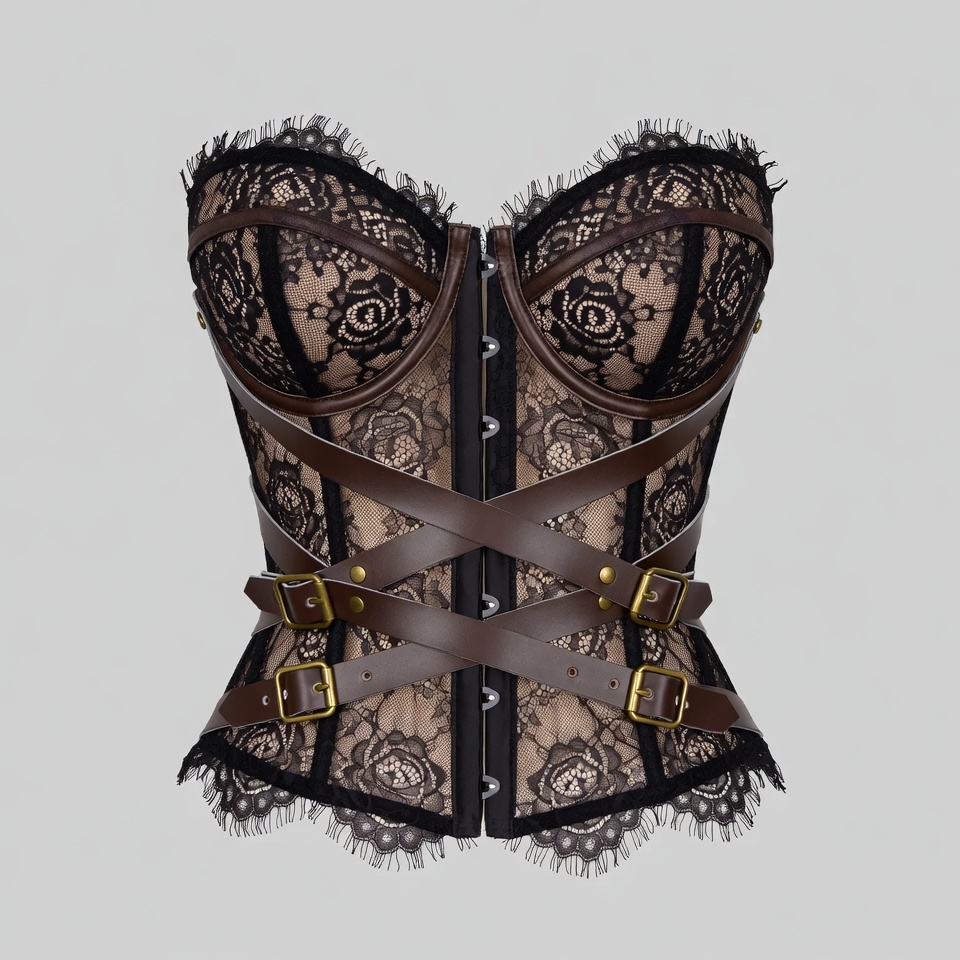 Victorian style, black lace, brown leather, buckles, fashion, floral lace, isolated background, lace trim, lingerie, metal clasps, sexy lingerie, steampunk, straps, undergarment, corset