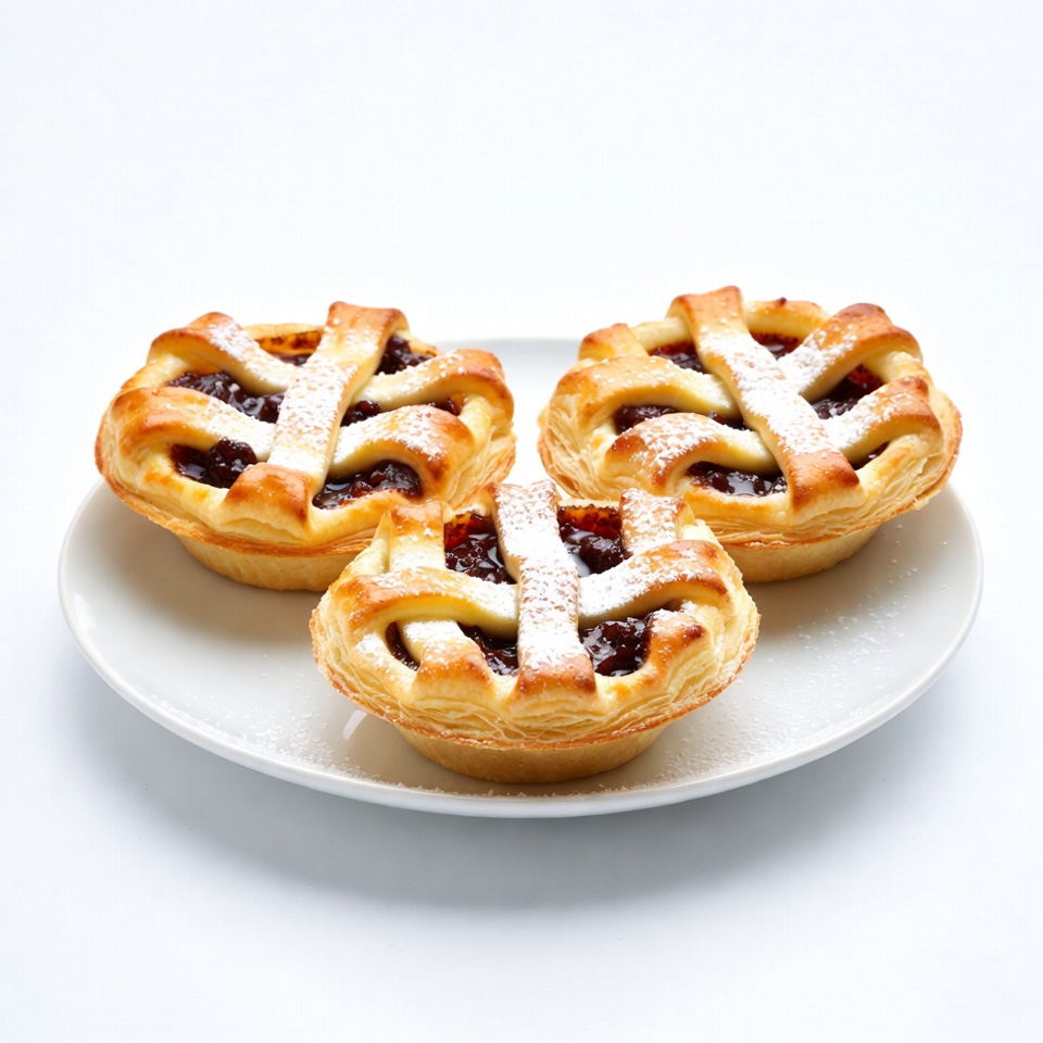 Three small jam tarts with lattice pastry tops and powdered sugar sit on a white plate. The tarts feature red jam filling visible through the crisscross pastry. They are arranged closely together against a plain white background.