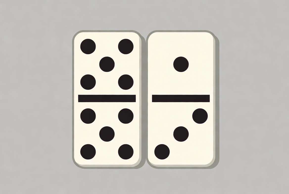 Two white domino tiles are placed side by side on a gray background. The left domino shows six black dots on each half, separated by a line. The right domino has one dot on the left half and two dots on the right half.