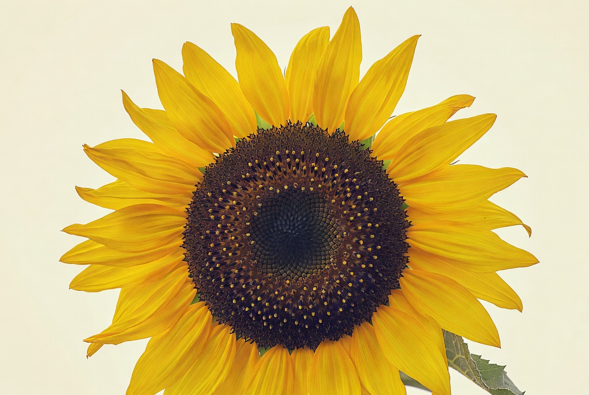 bloom, brown center, closeup, floral, flower, green stem, isolated, leaves, macro, nature, seeds, vibrant, white background, yellow petals, sunflower
