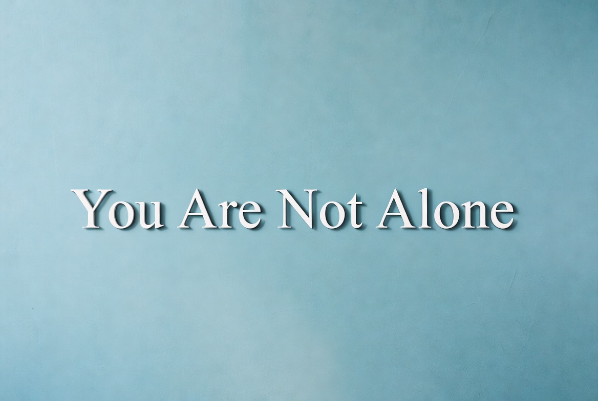 bold letters, encouragement message, inspirational text, isolated background, light blue background, motivational quote, shadow text, simple graphic, support phrase, white text, you are not alone