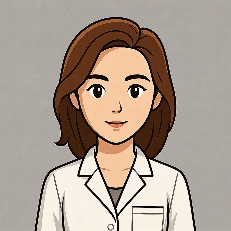 A cartoon illustration of an Asian woman with shoulder-length brown hair and a friendly smile. She wears a white lab coat over a gray top, standing against a plain gray background. Her large expressive eyes and simple line art style give her a cheerful appearance.