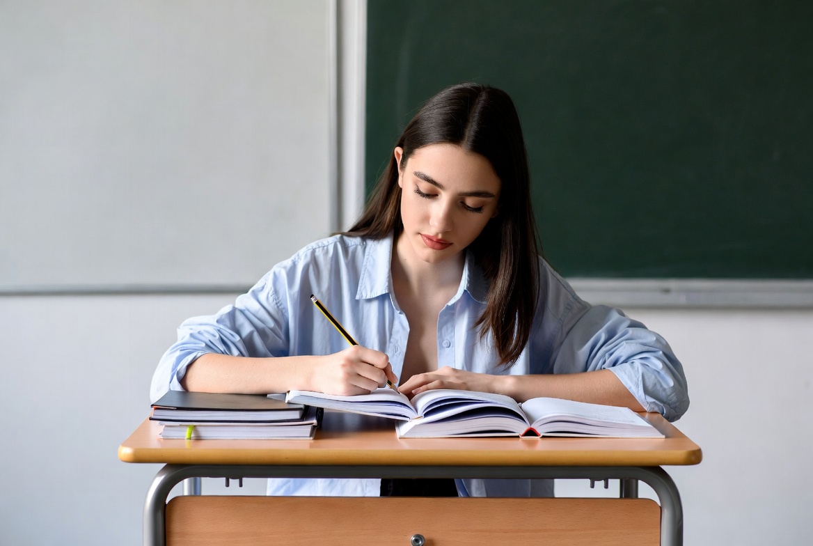 A young woman with long dark hair sits at a wooden school desk, writing in an open notebook with a blue pencil. She wears a light blue shirt with rolled sleeves and is positioned in front of a green chalkboard. Several stacked notebooks and books are on the desk.