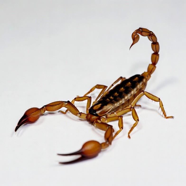 animal, arachnid, arthropod, brown scorpion, claws, desert scorpion, exoskeleton, isolated background, legs, macro photo, pincers, segments, stinger, tail, venomous, white background, scorpion