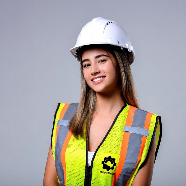 Latina, brown hair, construction worker, engineer, female, gear logo, hard hat, headshot, isolated background, long hair, portrait, professional, reflective stripes, safety gear, safety vest, smiling, white helmet, yellow vest, young woman, woman