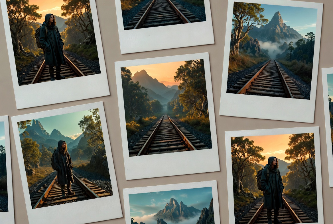 A collage of polaroid-style photos features a hiker in a dark hooded jacket walking along railroad tracks through scenic mountain landscapes. The images capture misty peaks, lush green trees, and dramatic sunset lighting in various angles. The arrangement is displayed against a light beige background.