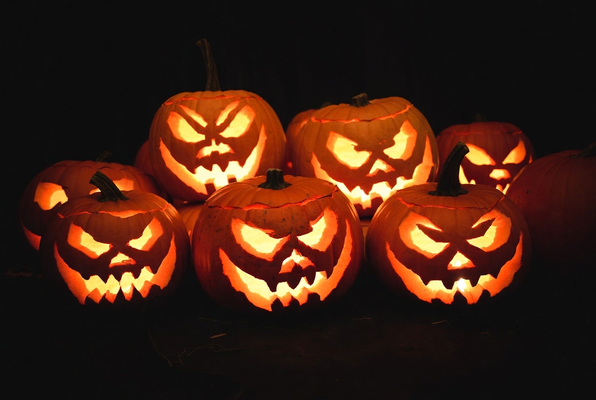 Halloween, Halloween decoration, autumn, carved faces, carved pumpkin, cluster, dark background, eerie, frightening, glowing, holiday, illuminated, jack o lantern, lit pumpkin, orange light, pumpkin, pumpkin patch, scary face, spooky, jack-o-lantern