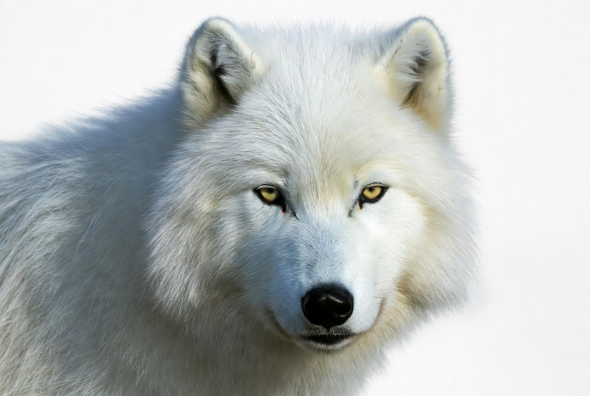 animal, black nose, canine, closeup, fluffy fur, isolated background, mammal, pointed ears, portrait, predator, snow wolf, white fur, white wolf, wild animal, wildlife, wolf, yellow eyes, arctic wolf
