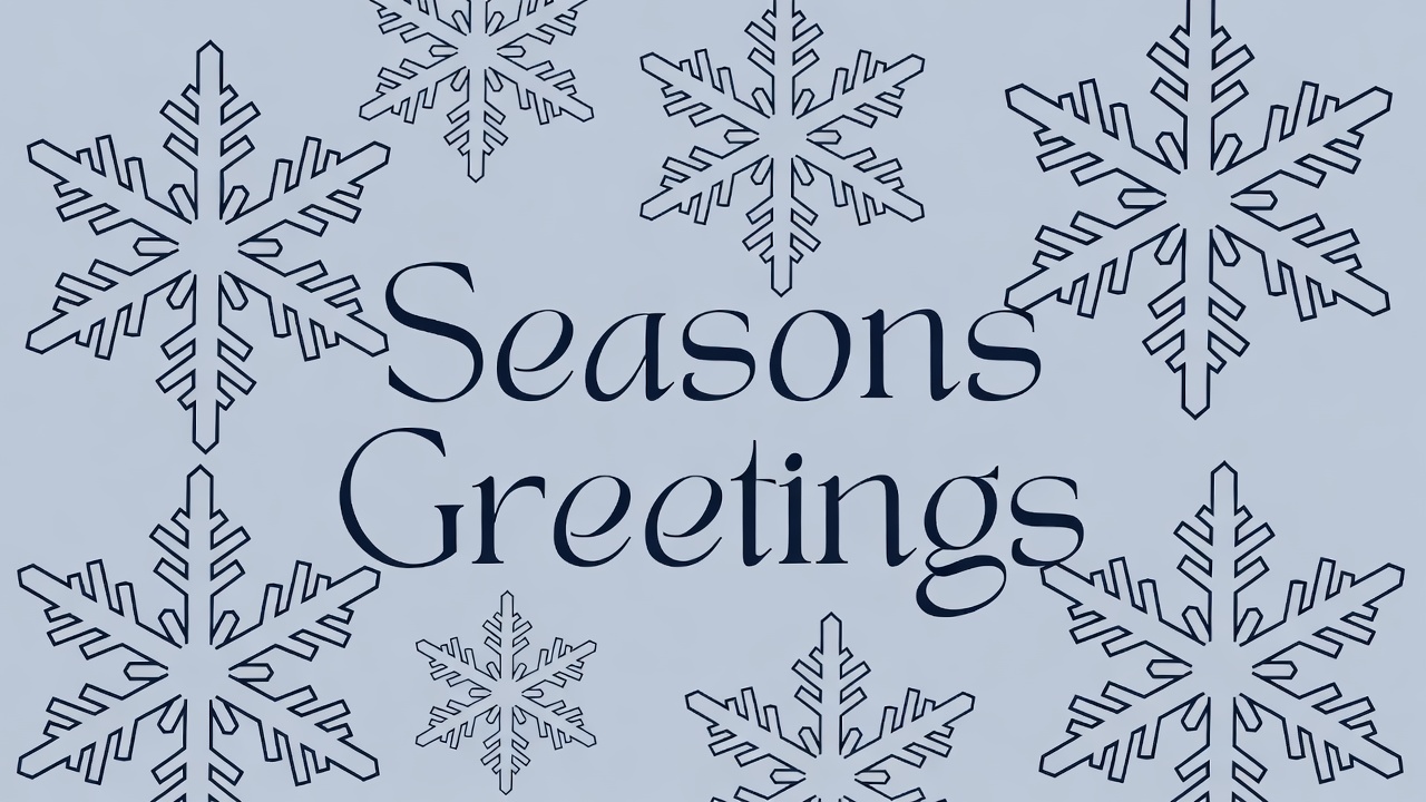 A clipart illustration features the text 'Seasons Greetings' in elegant cursive font centered on a light blue background. Surrounding the text are multiple white outline snowflakes of varying sizes. The design is simple and festive for holiday use.