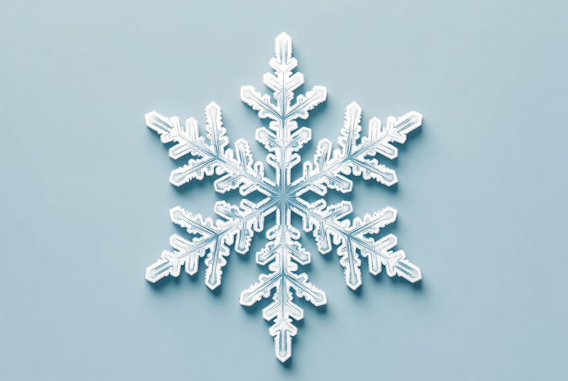 A detailed white snowflake with intricate symmetrical branches is centered on a light blue background. The snowflake features pointed tips and delicate patterns, creating a crisp 3D effect. It is isolated against the solid pastel blue surface.