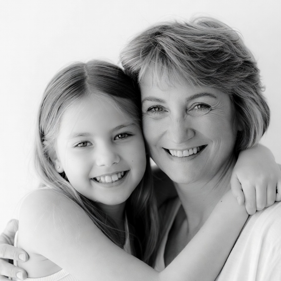 A black and white portrait shows a smiling woman with short wavy hair embracing her young daughter. The girl with long hair smiles up at her mother, both gazing at the camera. They stand close together against a plain white background.