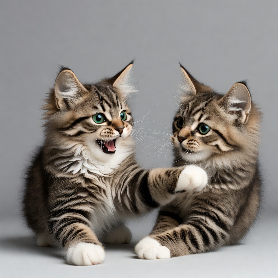 Two fluffy tabby kittens with green eyes are playfully wrestling on a light gray background. One kitten has its mouth open in a meow while pawing at the other, both showing striped fur and white paws. Their fur is soft and detailed, capturing a moment of kitten interaction.