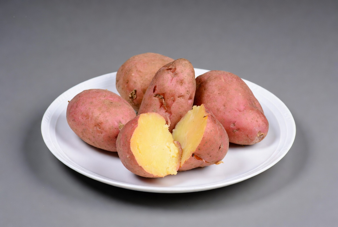 food, fresh potatoes, gray background, isolated, potato halves, produce, red potatoes, sliced potato, spuds, tubers, vegetables, white plate, whole potatoes, yellow flesh, potatoes