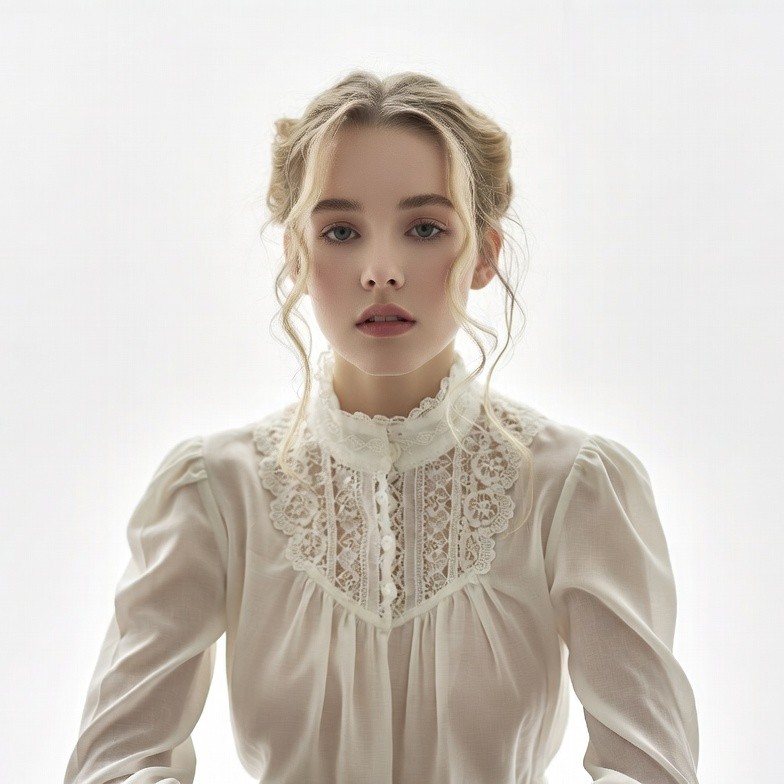 A young woman with blonde hair styled in an updo gazes at the camera. She wears a white Victorian-style blouse featuring intricate lace collar, puffed sleeves, and delicate embroidery. The image is set against a plain white background.