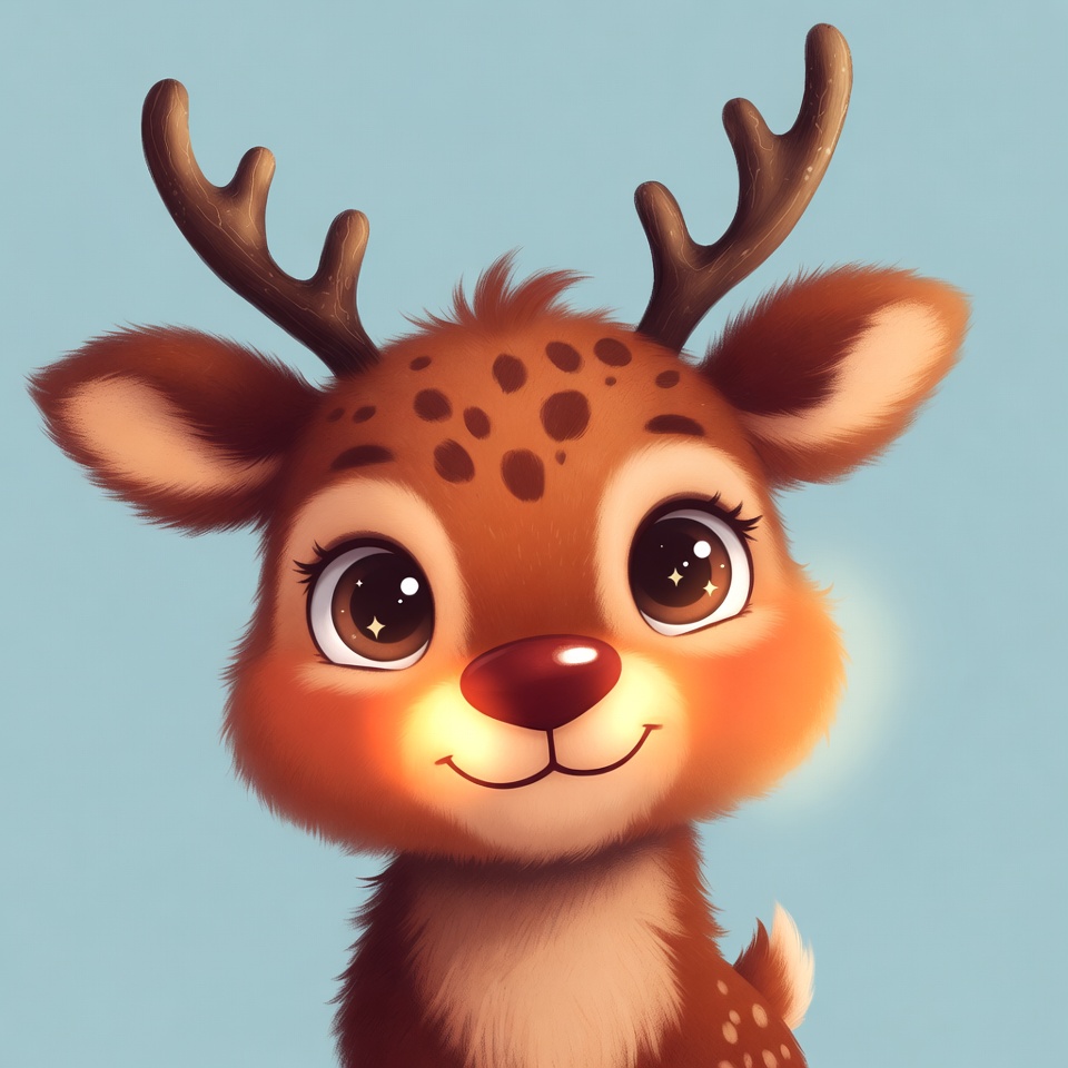 A cute illustrated baby reindeer with large sparkling eyes and brown fur stands on a light blue background. It has prominent antlers, white spots on its face, and a shiny red nose. The reindeer smiles happily with fluffy fur details.