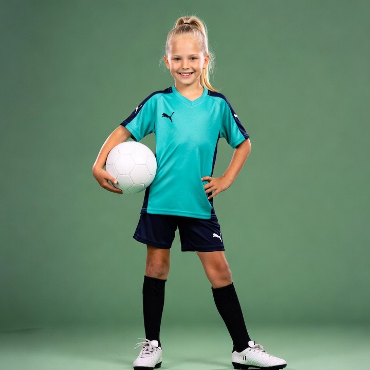 A young blonde girl with a ponytail smiles confidently while holding a white soccer ball. She wears a teal PUMA soccer jersey with navy shorts, black socks, and white cleats. She stands with one hand on her hip against a green background.