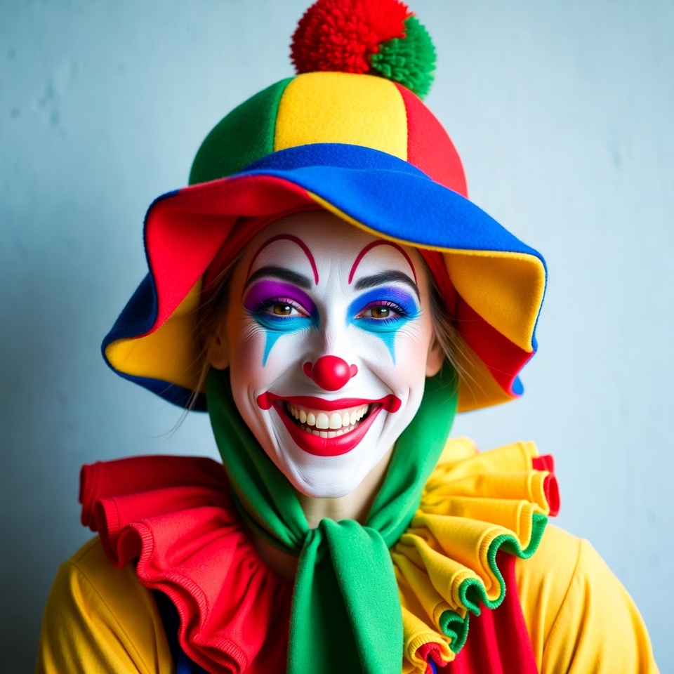 A woman dressed as a clown wears a multicolored jester hat with a red pom-pom and heavy white, black, purple, and red face makeup. She has a wide red smile, green ruffled collar, yellow outfit with red and multicolored ruffles, and poses against a solid blue background. Her expression is joyful with bright eyes and grinning teeth.
