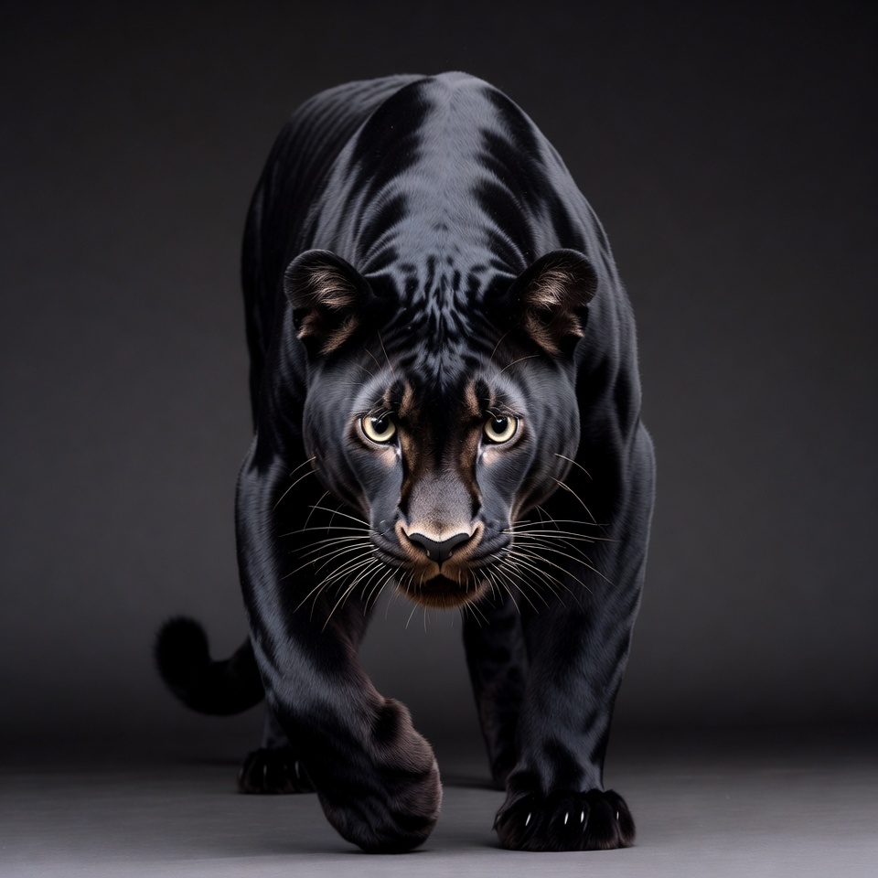 A sleek black panther with glossy fur prowls forward on a dark isolated background. Its intense yellow eyes gaze directly ahead, with whiskers extended and muscles tensed. The powerful paws and long tail emphasize its predatory stance.