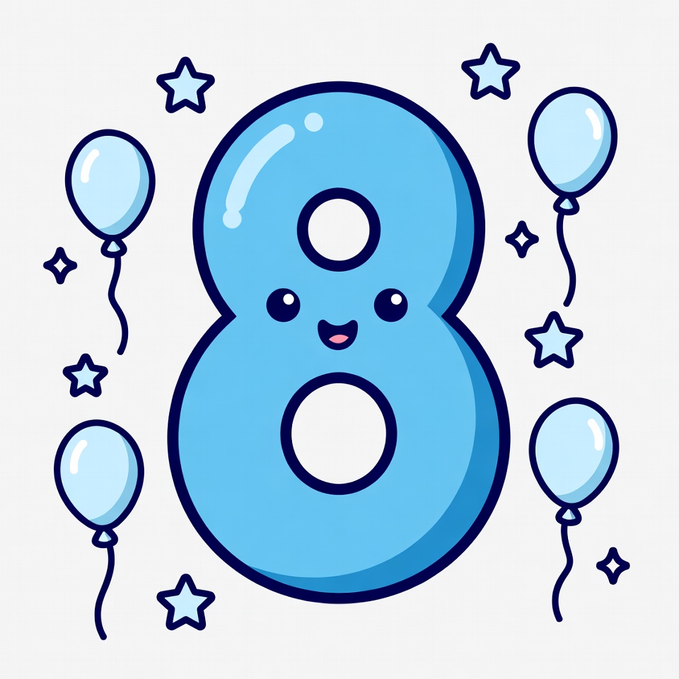 A kawaii-style blue number 8 with a happy smiling face is surrounded by light blue balloons and white stars. The illustration features glossy outlines and a simple white background. Balloons float around the cheerful cartoon digit.