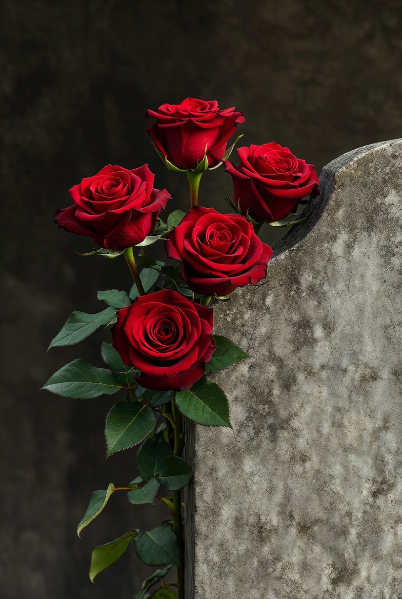 bouquet, cemetery, close-up, dark background, floral, flowers, gravestone, gray stone, green leaves, isolated, memorial, petals, roses, stems, stone, tombstone, vibrant red, red roses