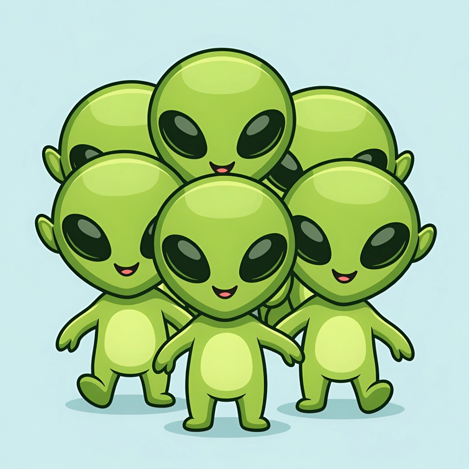 UFO creatures, alien group, cartoon aliens, clipart, cute aliens, extraterrestrial, fun aliens, green aliens, group aliens, illustration, isolated background, sci-fi characters, smiling aliens, vector art, aliens
