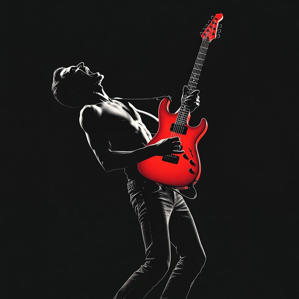 Ibanez guitar, black background, concert, dynamic pose, electric guitar, energy, guitar player, high contrast, instrument, jeans, male, muscular man, music, passion, performance, performing, playing guitar, red guitar, rock musician, rocker, shirtless, shredding, silhouette, stage, torso, man