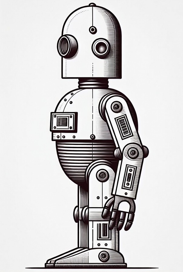 drawing, engraving style, goggle eyes, illustration, line art, mechanical, metallic, retro robot, robot arms, robot design, robot illustration, robot legs, sci-fi, side view, vintage robot, white background, robot