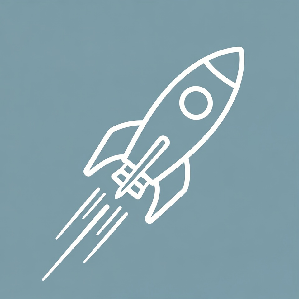 A simple line art illustration of a rocket launching upward on a solid teal background. The white outline depicts the rocket with flames trailing from its base and a circular window on the body. It is angled diagonally to suggest motion.